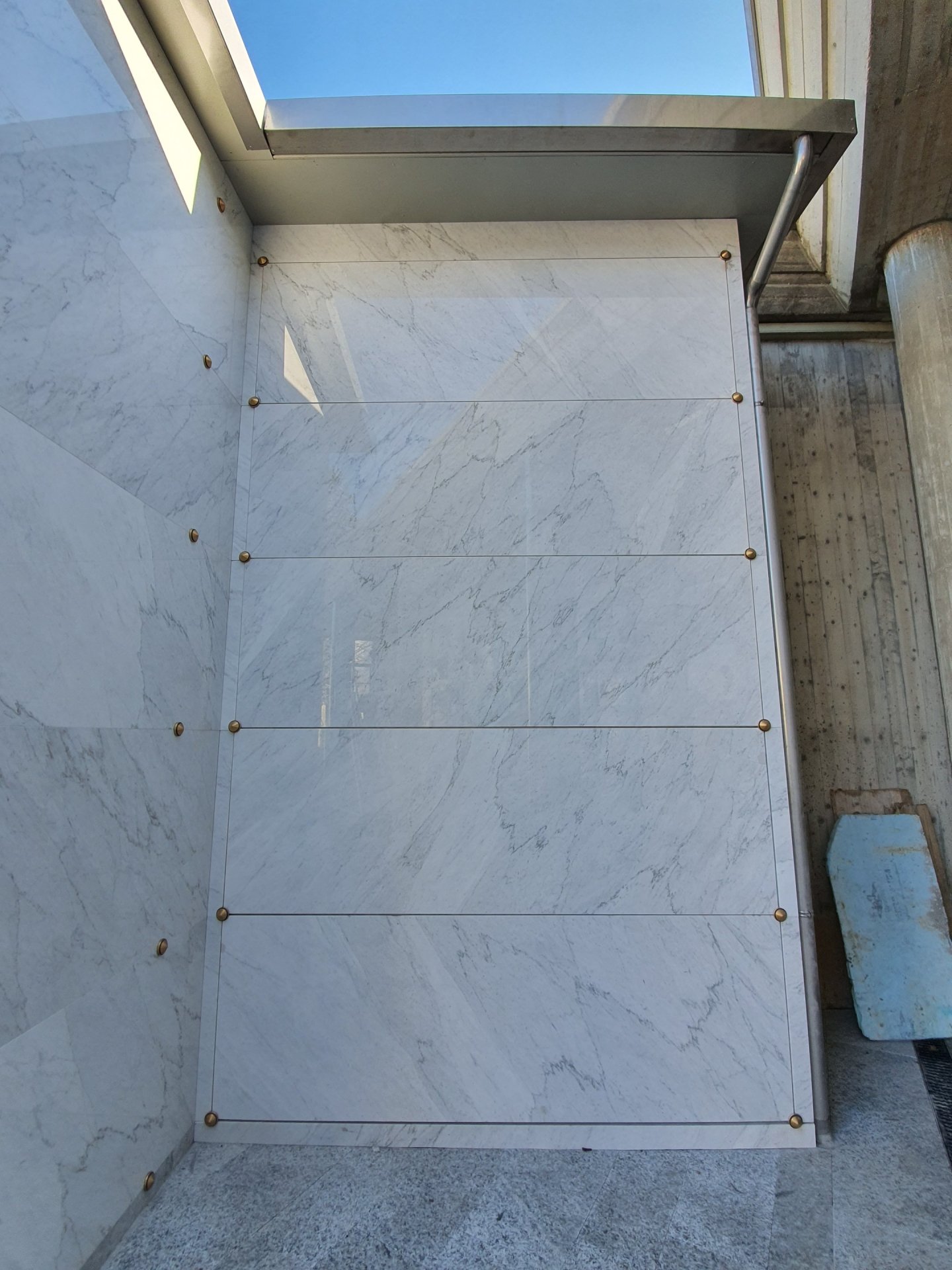 Il traverso anteriore del ripiano viene realizzato con un profilo speciale, di pari sezione, ma dotato di una aletta anteriore sporgente mm 15, idonea per l’appoggio e il sostegno della lapide in marmo; la lapide, in seguito, viene fissata alla struttura mediante borchie in bronzo.